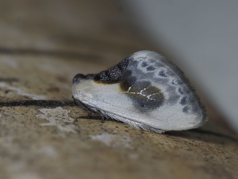 This moth derives its English name from the raised tufts of scales on the thorax, which resembles a pair of spectacles when viewed from the front.